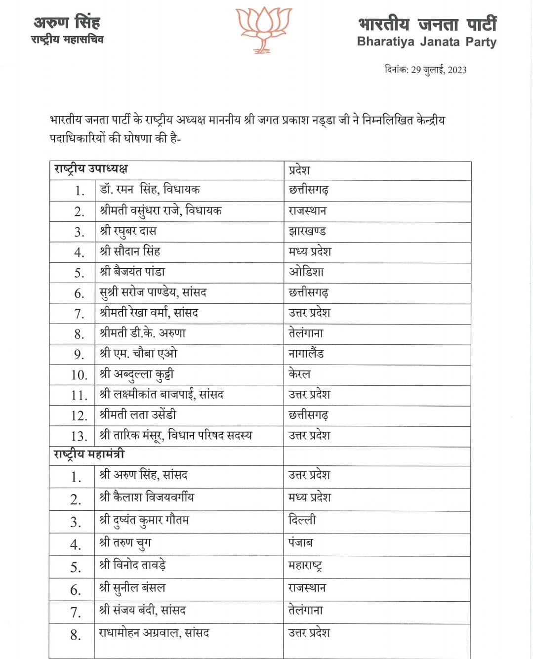 - वही बीएल संतोष को राष्ट्रीय महामंत्री संगठन बनाया गया है।इसमें रमन सिंह और वसुंधरा राजे को राष्ट्रीय उपाध्यक्ष बनाया गया है। वहीं, बंडी संजय कुमार और राधामोहन अग्रवाल को महासचिव बनाया गया है।