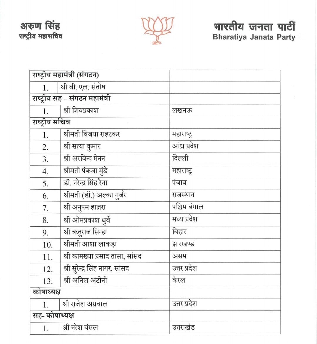 - इसके अलावा राजस्थान के सुनील बंसल महामंत्री बनाए गए है। अलका गुर्जर को भी संगठन में रिपीट किया गया है, उन्हें राष्ट्रीय सचिव की जिम्मेदारी दी गई है। उत्तर प्रदेश से सांसद अरुण सिंह, सांसद राधामोहन अग्रवाल, मध्य प्रदेश से कैलाश विजयवर्गीय, दिल्ली से दुष्यंत कुमार गौतम, राजस्थान से सुनील बंसल, महाराष्ट्र से विनोद तावड़े, पंजाब से तरुण चुग, तेलंगाना से सांसद संजय बंदी को राष्ट्रीय महामंत्री बनाया गया है।