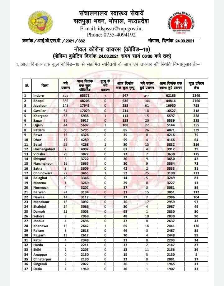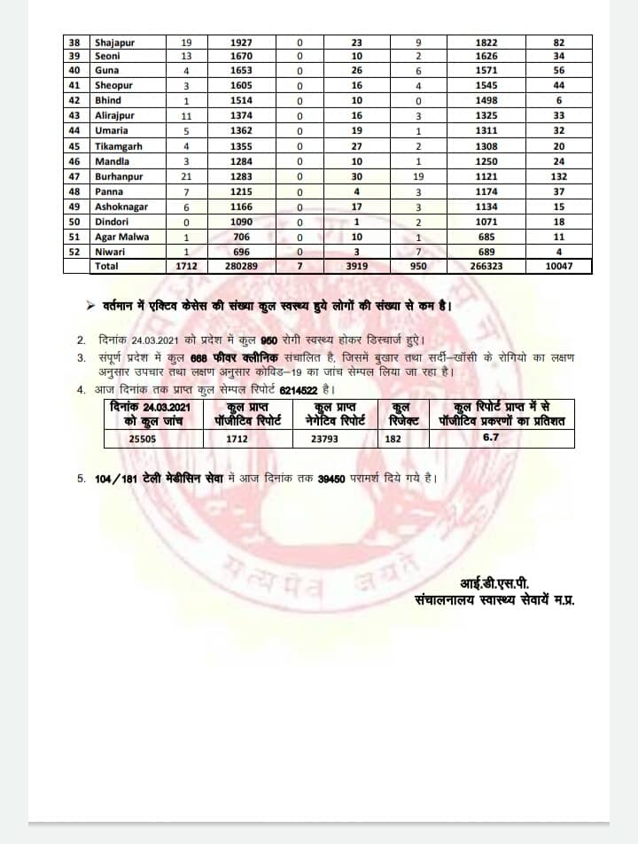 बीते 24 घंटे में डिंडोरी और अनूपपुर को छोड़कर प्रदेश के सभी जिलों में पॉजिटिव मरीज सामने आए हैं। वही भोपाल और जबलपुर पॉजिटिव मरीजों में 1 सप्ताह में 100% की वृद्धि देखी गई है। बता दें कि प्रदेश के 4 बड़े शहर राजधानी भोपाल इंदौर जबलपुर और ग्वालियर में संक्रमण की रफ्तार तेज है। इसके अलावा बैतूल, खरगोन में भी पॉजिटिव केस की संख्या बढ़ रही है। पिछले 24 घंटे में खरगोन में 63 और बैतूल में 55 नए संक्रमित मरीज सामने आए हैं।