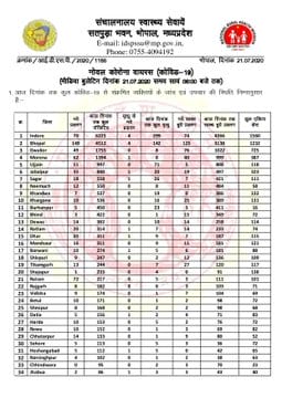 बता दें कि सबसे ज्यादा गंभीर स्थिति प्रदेश के भोपाल जिले की है जहां आज कुल 149 मरीजों की रिपोर्ट पॉजिटिव आई है। हालांकि 125 स्वस्थ हो अपने घर भी लौट चुके हैं। जबकि 4 की मृत्यु हो चुकी है। वही इंदौर में आज 70 मरीजों की पुष्टि हुई है। वहीं 74 मरीज स्वस्थ होकर अपने घर वापस लौट गए हैं। इसी के साथ इंदौर में संक्रमित मरीजों की संख्या बढ़कर 6225 हो गई है जबकि 4366 लोग अब तक स्वस्थ हो चुके हैं। वही ग्वालियर में 48, मुरैना में 62, उज्जैन में 11, रायसेन 72 नए मरीजों की पुष्टि हुई है। रायसेन में कोरोना के गंभीर हालत को देखते हुए गृह मंत्री नरोत्तम मिश्रा द्वारा जेलर को सस्पेंड कर दिया गया है।