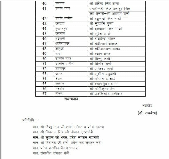 भोपाल, डेस्क रिपोर्ट। आगामी उप चुनावों (Upcoming By-election) से पहले मध्य प्रदेश बीजेपी (MP BJP) ने प्रदेश पदाधिकारियों को जिलों के प्रभार सौंपे दिए है। इसमें 57 प्रदेश पदाधिकारियों को बीजेपी प्रदेश अध्यक्ष वीडी शर्मा (VD Sharma) जिलों का प्रभार सौंपा है।इस संबंध में प्रदेश कार्यालय मंत्री राघवेंद्र ने लिस्ट जारी कर दी है।