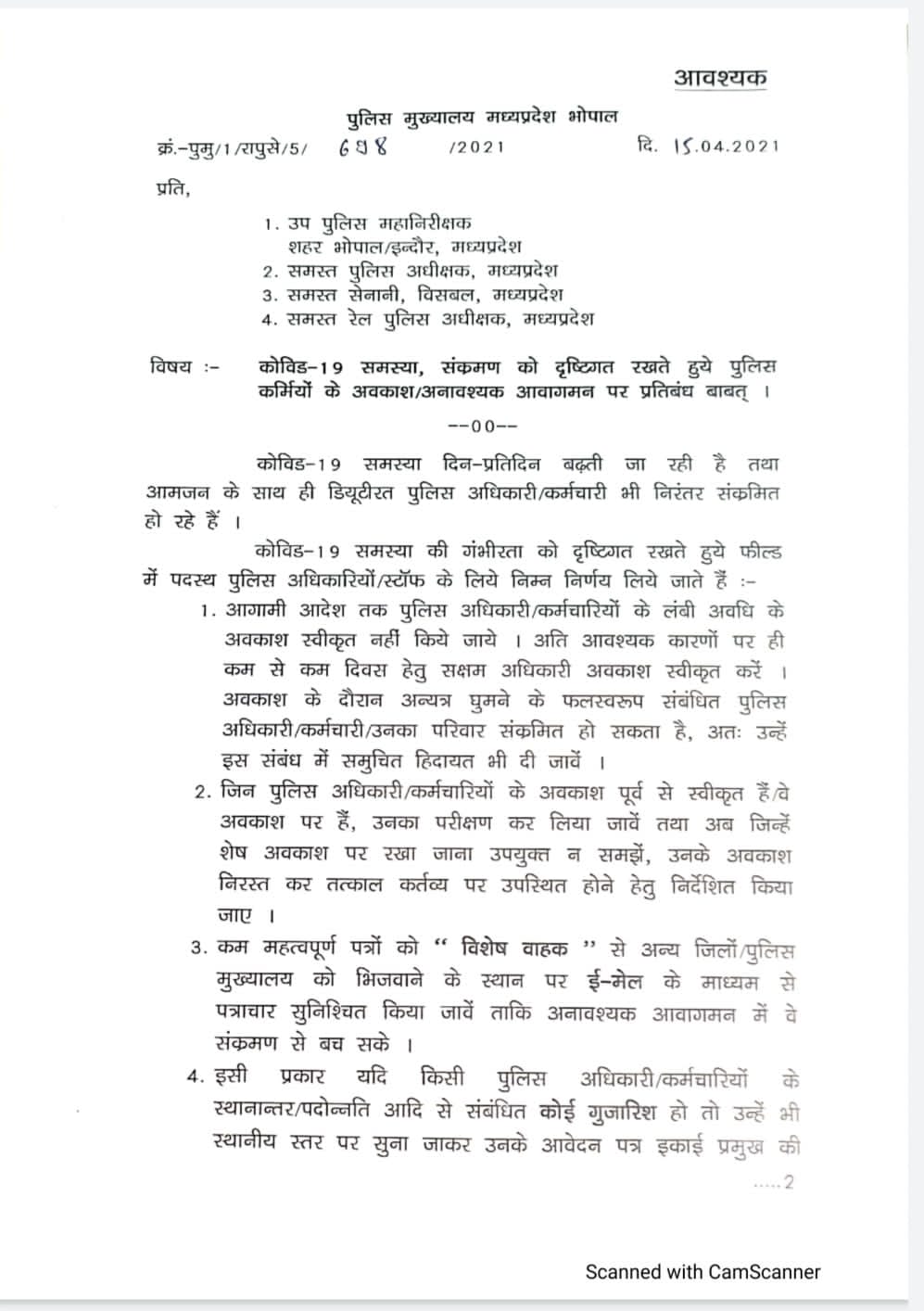 पुलिस मुख्यालय (Police headquarter) द्वारा जारी आदेश के अनुसार कोविड 19 के बढ़ते कहर को देखते हुए निर्देश दिए गए हैं कि पुलिस अधिकारियों और कर्मचारियों को लंबी अवधि के लिए अवकाश स्वीकृत न किये जाएं। बहुत जरूरी कारण होने पर ही छुट्टी स्वीकृत की जाएगी। साथ ही कहा गया है कि छुट्टी के दौरान कहीं बाहर जाने या घूमने के कारण पुलिस अधिकारी/कर्मचारी स्वयं या उनका परिवार कोरोना संक्रमित हो सकता है। इसलिए इसे लेकर समुचित हिदायद दी जाए।