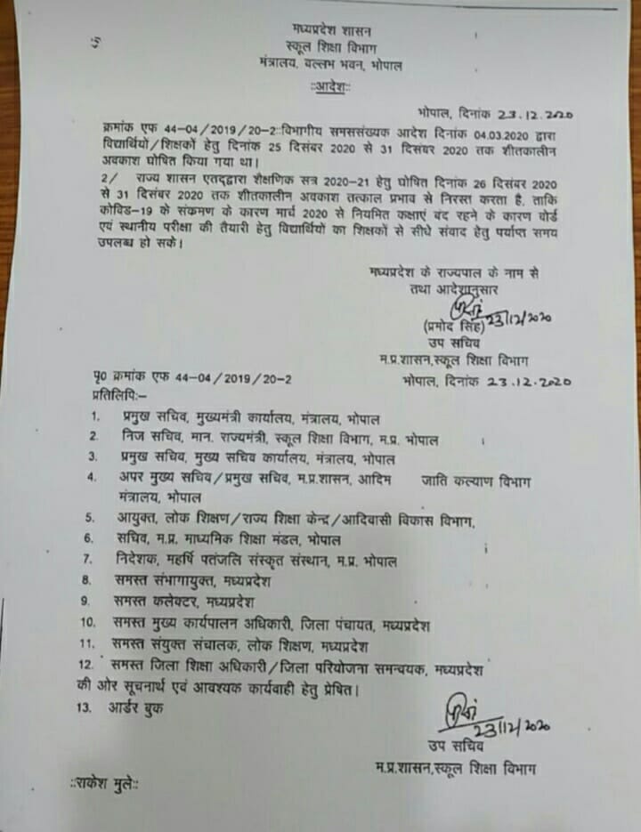 इस आदेश के बाद केवल 25 दिसंबर क्रिसमस के अवसर पर स्कूलों की छुट्टी रहेगी, शेष सभी दिन नियमित कक्षाओं का संचालन होगा। जारी आदर्श में कहा गया कि 4 मार्च को जारी आदेश जारी कर विद्यार्थियों/शिक्षकों के लिए 25 दिसंबर 2020 से 31 दिसंबर 2020 तक शीतकालीन अवकाश घोषित किया गया था। लेकिन राज्य शासन द्वारा शैक्षणिक सत्र 2020-21 के लिए घोषित शीतकालीन अवकाश तत्काल प्रभाव से निरस्त किया है।