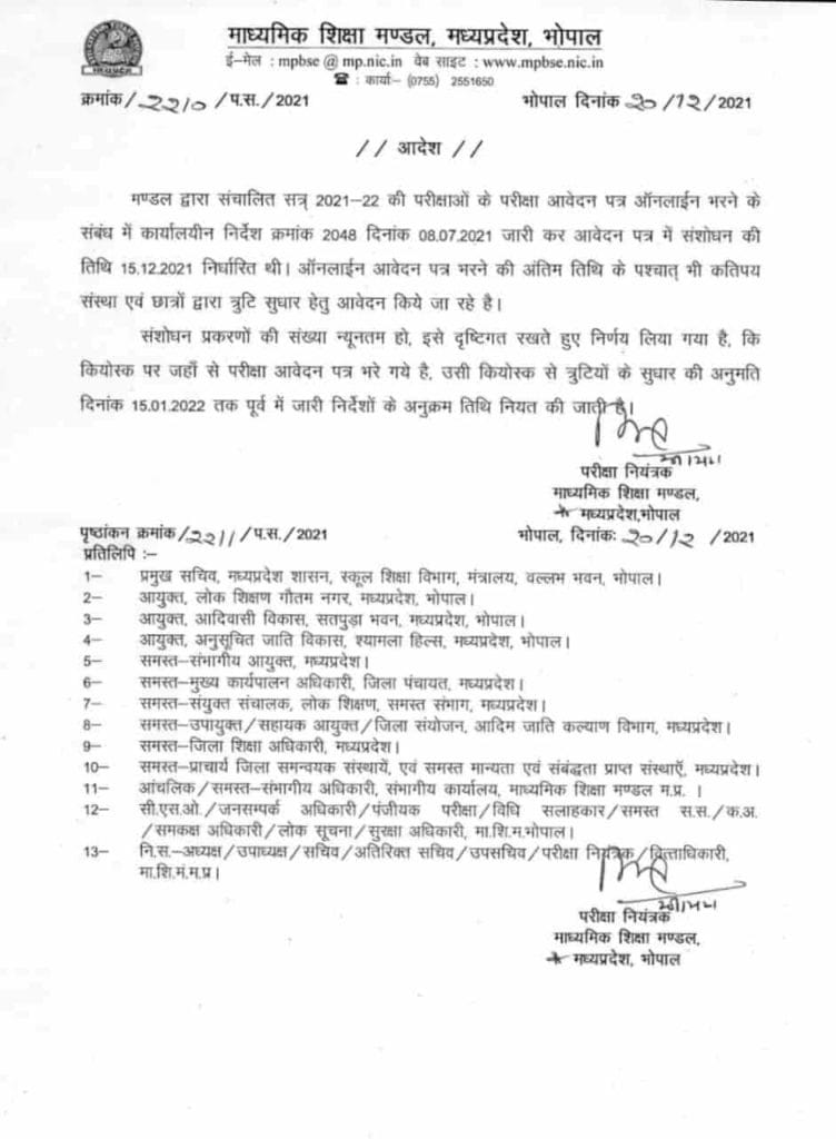 MPBSE की तरफ से जारी आदेश के मुताबिक MP Board 10वीं-12वीं बोर्ड परीक्षा के लिए छात्र 15 जनवरी 2022 तक फॉर्म में संशोधन कर सकेंगे। माध्यमिक शिक्षा मंडल (Board of Secondary Education) की तरफ से जारी आदेश के मुताबिक सत्र 2021-22 की परीक्षाओं के लिए आवेदन पत्र ऑनलाइन बढ़ने के संबंध में 8 जुलाई को आवेदन पत्र में संशोधन की तिथि 15 दिसंबर 2021 निर्धारित की गई थी।