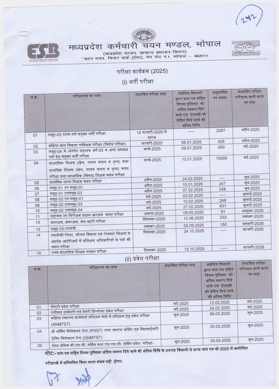 MPESB Exam Calender 2025 : मध्यप्रदेश कर्मचारी चयन मंडल ने 2025 में होने वाली परीक्षाओं का संभावित कैलेंडर जारी कर दिया है। MPESB ने कुल 20 भर्ती परीक्षाओं का कैलेंडर जारी किया है, इनमें से 15 भर्ती और 5 प्रवेश परीक्षाएं है।ये परीक्षाएं फरवरी से दिसंबर 2025 के बीच आयोजित की जाएगी। भर्ती परीक्षाओं के माध्यम से विभिन्न विभागों में करीब 15 हजार पदों पर नियुक्ति की जाएगी।