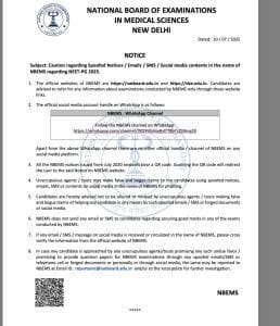 - ध्यान रखें कि किसी भी परीक्षा में अच्छे अंक प्राप्त करने पर एनबीईएमएस कैंडिडेट्स को किसी प्रकार का एसएमएस या ईमेल नहीं भेजता.यदि आपको सोशल मीडिया पर ऐसा कोई भी एसएमएस या ईमेल प्राप्त होता है या सर्कुलर होता है, तो इसे एक बार ऑफिशियल वेबसाइट पर जाकर सत्यापित जरूर करें।