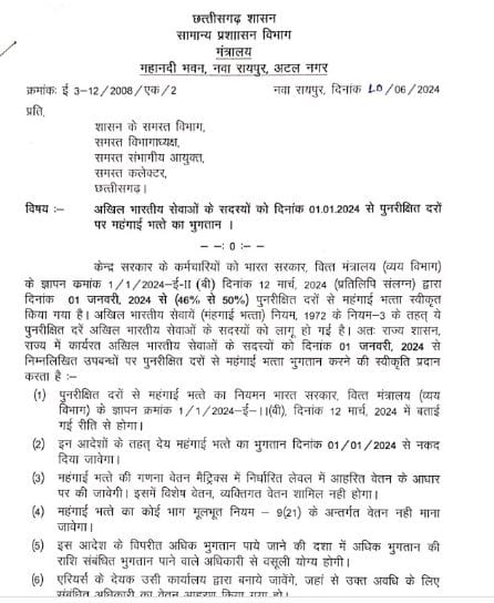 Chhattisgarh DA Hike 2024: छत्तीसगढ़ के सरकारी अधिकारियों के लिए खुशखबरी है। राज्य की विष्णु साय सरकार ने अखिल भारतीय सेवा के अधिकारियों को डीए का बड़ा तोहफा दिया है।राज्य सरकार ने 4 फीसदी महंगाई भत्ते में वृद्धि के आदेश जारी कर दिए है। इसके बाद डीए 46 फीसदी से बढ़कर 50 फीसदी हो गया है। इस संबंध में सामान्य प्रशासन विभाग ने आदेश जारी कर दिया है।