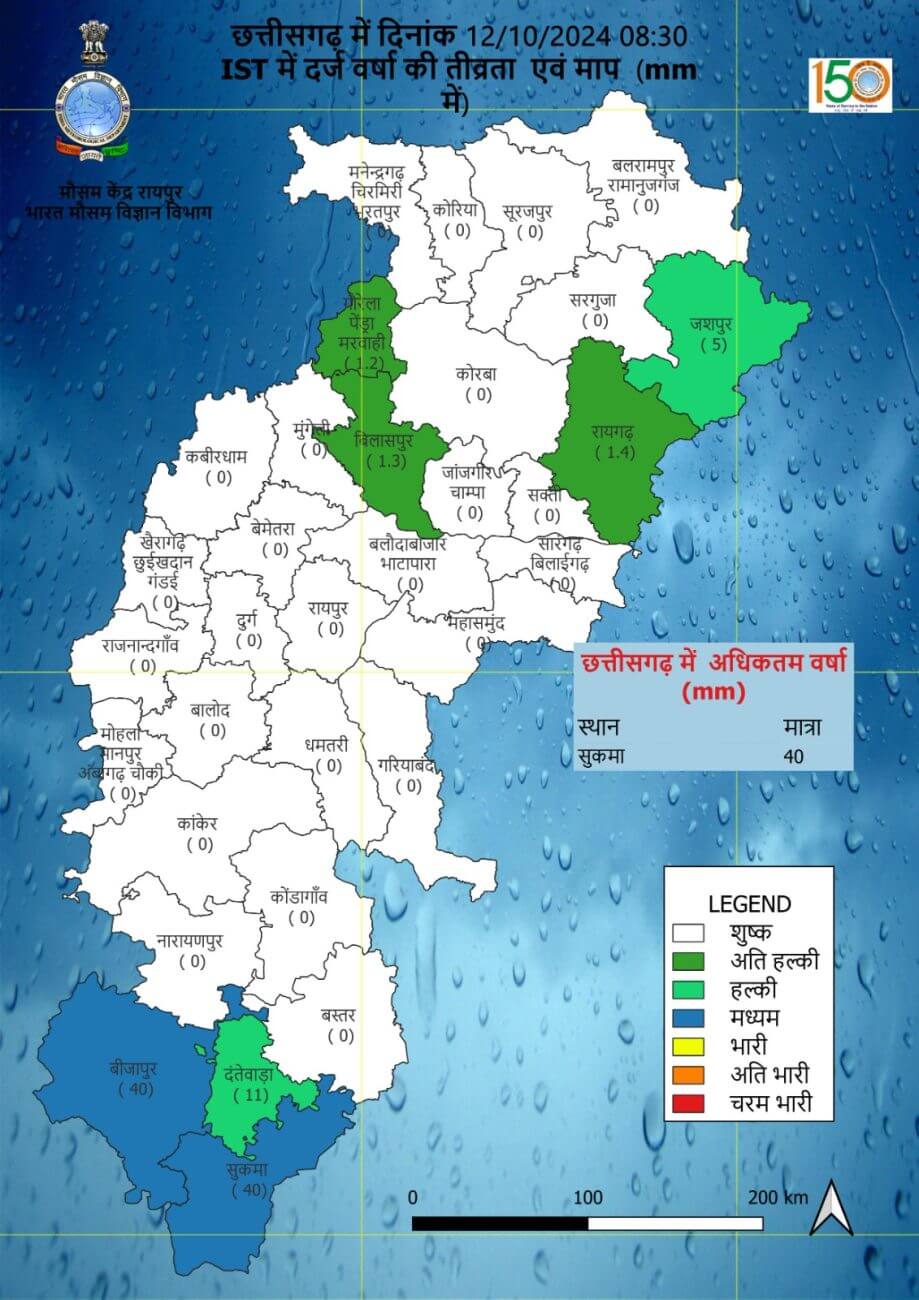 - राज्य के विभिन्न जिलों में 01 जून 2024 से आज 12 अक्टूबर सवेरे तक रिकार्ड की गई वर्षा के अनुसार बीजापुर जिले में सर्वाधिक 2444.3 मिमी और बेमेतरा जिले में सबसे कम 609.0 मिमी औसत वर्षा दर्ज की गयी है।