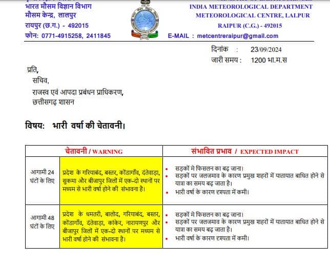 - बस्तर संभाग में भारी बारिश की संभावना है।