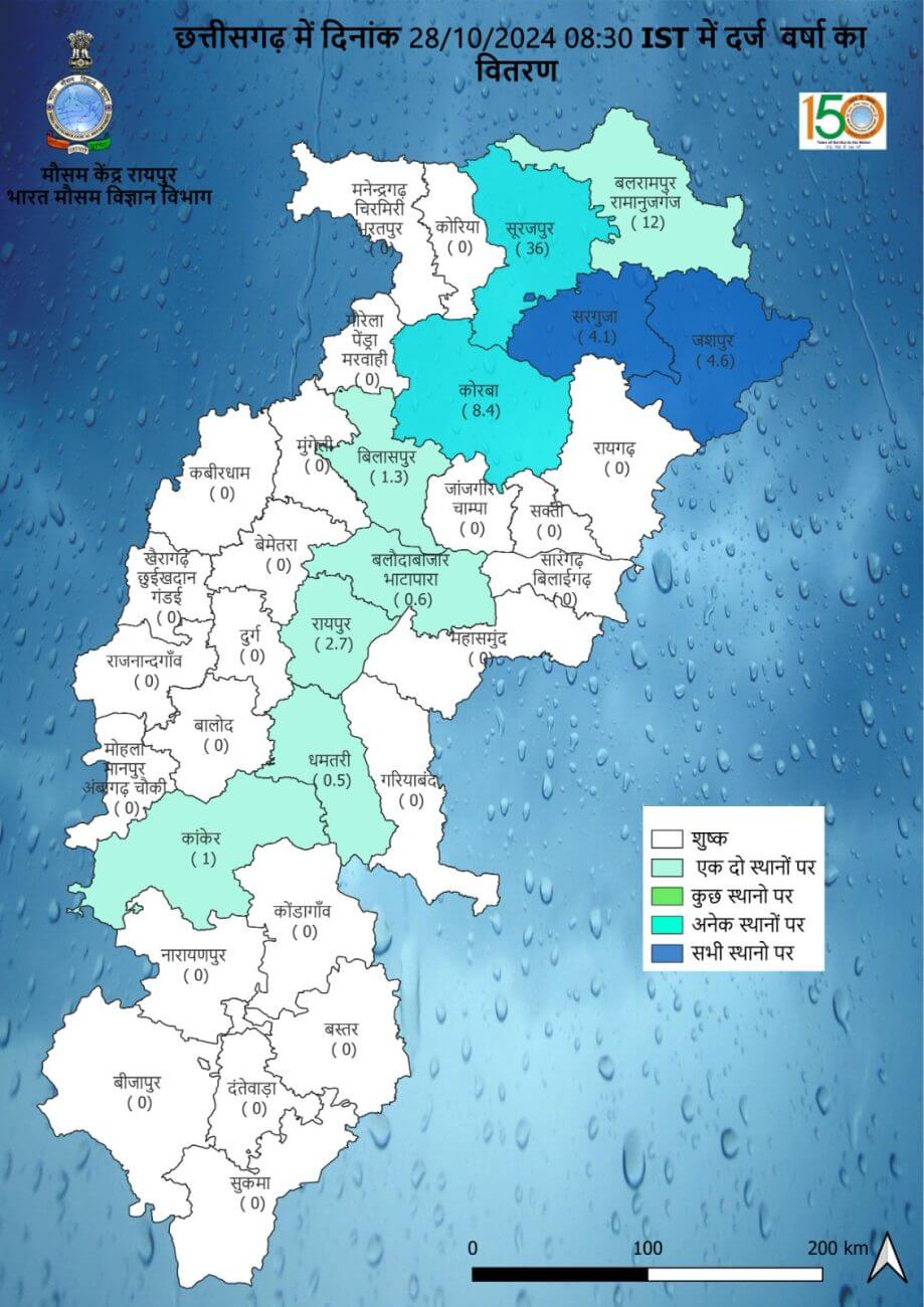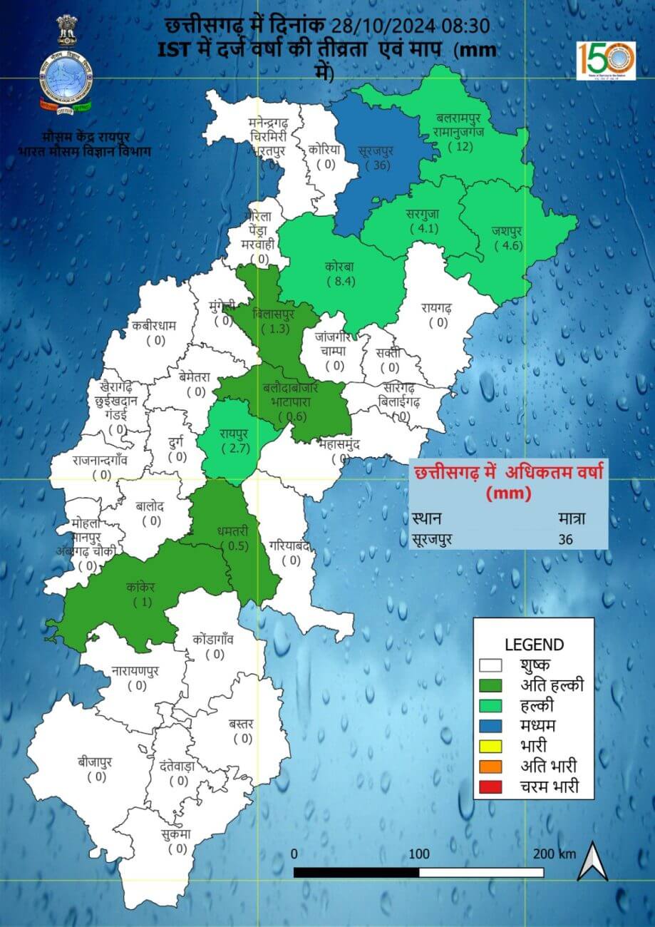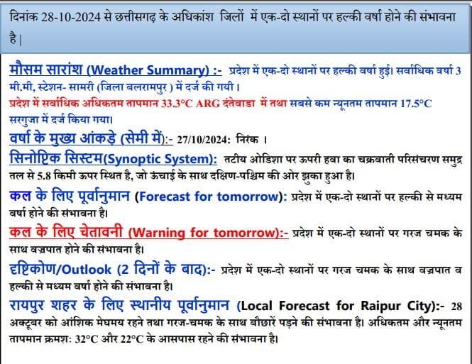छत्तीसगढ़ मौसम विभाग के मुताबिक, 29-30 अक्टूबर को सरगुजा, बिलासपुर, रायपुर, दुर्ग और बस्तर संभाग के साथ पूर्वी जिलों दंतेवाड़ा, कांकेर, कोरबा ,रायपुर, बिलासपुर, और जगदलपुर में बादल बारिश के आसार है, कुछ इलाकों में गरज-चमक के साथ वज्रपात भी हो सकता है, बाकी जिलों में मौसम शुष्क रहेगा।नवंबर की शुरूआत से तापमान में तेजी से गिरावट आएगी और गुलाबी ठंड का अहसास होने लगेगा।