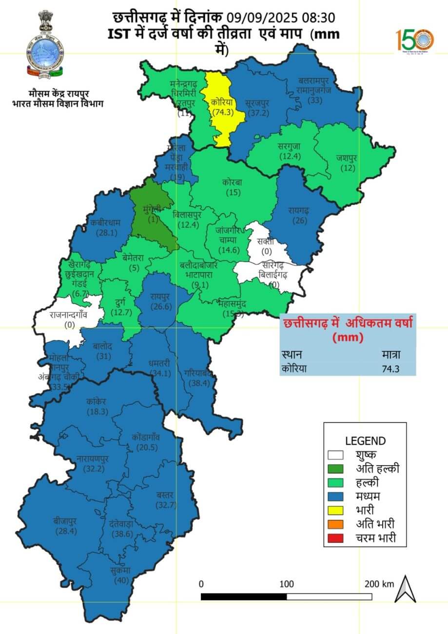 सुकमा, बीजापुर, जशपुर, कबीरधाम,सरगुजा, बलरामपुर दक्षिण बस्तर दंतेवाडा, बस्तर, नारायणपुर, बलौदा बाजार, जाजंगीर-चांपा, रायगढ़, कोंडागांव, उत्तर बस्तर कांकेर, धमतरी, बालोद, राजनांदगांव , गरियाबंद, महासमुंद, रायपुर, बिलासपुर, कोरबा, गौरेला-पेंड्रा-मरवाही, दुर्ग, बेमेतरा, मुंगेली, सूरजपुर, कोरिया में मेघगजर्गन / आकाशीय बिजली / अचानक तेज हवा (30-40 KMPH) के साथ मध्यम वर्षा है।