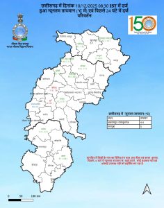 - 11-12 दिसंबर को सुरजपुर, बलरामपुर, कोरिया, सरगुजा, बिलासपुर, दुर्ग तथा रायपुर जिलों के एक-दो पॉकेट तीव्र शीत लहर की चेतावनी।