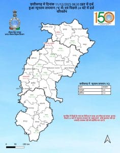 - 11.12.2025 से 12.12.2025 के लिए: कोरिया, मनेन्द्रगढ़-चिरमिरी-भरतपुर, सरगुजा, जशपुर, सूरजपुर, बलरामपुर, रायगढ़, गौरेला पेण्ड्रा मारवाही, कबीरधाम, मुंगेली, बिलासपुर, सारंगढ़ बिलाईगढ़, खैरागढ़ छुईखदान गंडाई, राजनांदगाँव, बेमेतरा, रायपुर, दुर्ग, बालोद और कोरबा में एक दो पॉकेट में शीत लहर।