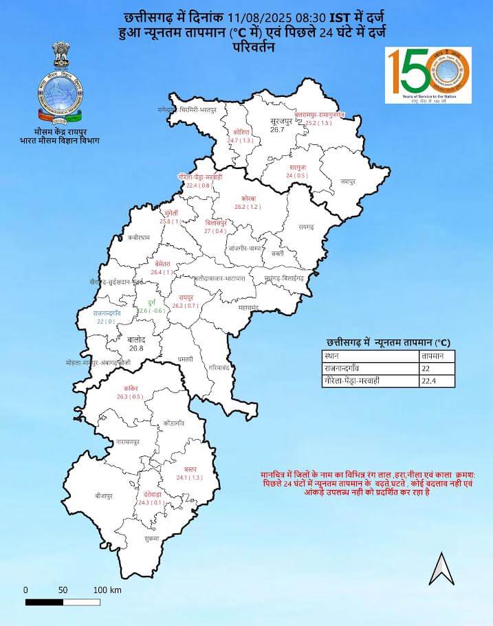 अगले 48 घंटों बाद छत्तीसगढ़ के मौसम में बड़ा बदलाव देखने को मिलेगा। मंगलवार 12 अगस्त से पूरे प्रदेश में वर्षा की गतिविधि में वृद्धि होने की संभावना है । 13 अगस्त के आसपास बंगाल की खाड़ी के उत्तर-पश्चिम और समीपवर्ती पश्चिम-मध्य में निम्न दबाव का क्षेत्र भी बनेगा जिससे प्रदेश के कुछ स्थानों भारी से बहुत भारी वर्षा होने की संभावना जताई गई है। आज सोमवार को 20 जिलों में हल्की से मध्यम बारिश, मेघगर्जन और बिजली गिरने चमकने की संभावना है।रायपुर में आकाश आंशिक मेघमय रहने तथा गरज चमक के साथ बौछारें पड़ने की संभावना है। अधिकतम और न्यूनतम तापमान क्रमशः 34°C और 26°C के आसपास रहने की संभावना है।