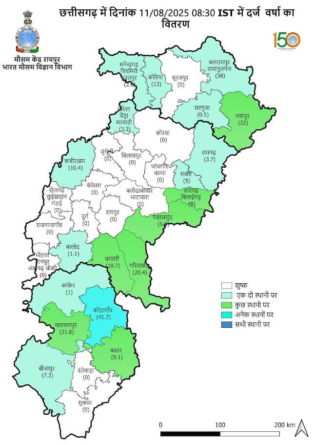 छत्तीसगढ़ में 1 जून से 11 अगस्त तक 660.0 मिमी औसत वर्षा दर्ज