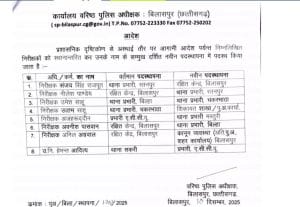 - रक्षित केन्द्र में पदस्थ अनिल अग्रवाल को कानून व्यवस्था (अति.पु.अ., शहर कार्यालय) और थाना सकरी में तैनात उप निरीक्षक हेमन्त आदित्य को ए.सी.सी.यू प्रभारी बनाया गया है।
