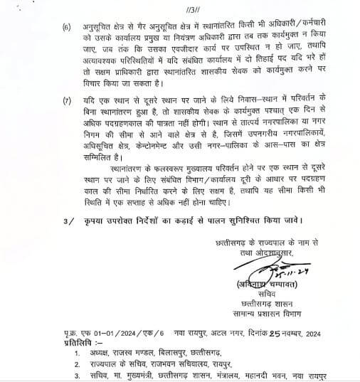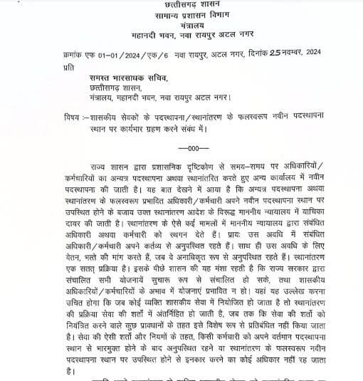 सामान्य प्रशासन विभाग ने इस संबंध में सभी विभाग प्रमुखों को अलग-अलग 7 बिंदुओं में दिशा निर्देश जारी किये है। इसमें कहा है कि सेवा की ऐसी शर्तों और नियमों के तहत किसी कर्मचारी को अपने वर्तमान पदस्थापना स्थान से भारमुक्त होने के बाद अनुपस्थित रहने या स्थानांतरण के फलस्वरूप नवीन पदस्थापना स्थान पर उपस्थित होने से इनकार करने का कोई अधिकार नहीं रह जाता है हालांकि स्थानांतरण से व्यथित शासकीय सेवक को स्थानांतरित स्थान पर उपस्थित होने तथा स्थानांतरण के विरूद्ध अपनी शिकायतों के निराकरण के लिए नियमों के तहत् उपलब्ध उपायों का लाभ उठाने का पूरा अधिकार है। ऐसी स्थिति में नई जगहों पर समय से अफसरों की तैनाती नहीं होने से शासकीय कार्य और परियोजनाओं में बाधा पैदा होती है।