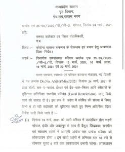 1. भोपाल, इंदौर, जबलपुर के साथ बैतूल, छिंदवाड़ा, खरगोन और रतलाम में आगामी आदेश तक प्रत्येक रविवार को लॉकडाउन होगा और इन 7 शहरों में शनिवार रात 10:00 बजे से सोमवार सुबह 6:00 बजे तक लॉकडाउन प्रभारी रहेगा। वही वस्तुओं, औद्योगिक इकाइयों के श्रमिक और कर्मियों और जो कच्चे माल तथा उत्पाद, बीमार व्यक्तियों के परिवहन। एयरपोर्ट। रेलवे स्टेशन आने जाने तथा परीक्षा प्रतियोगी में शामिल होने की छूट रहेगी।
