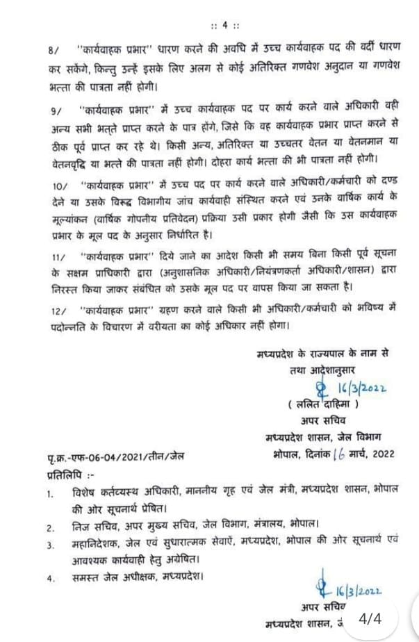 भोपाल, डेस्क रिपोर्ट। मध्य प्रदेश के अधिकारी कर्मचारियों (MP Employees) के लिए बड़ी खबर हैं। दरअसल अब जल्द ही इन कर्मचारियों को उच्च पद का प्रभार (high post charge) दिया जाएगा। इसके लिए आदेश जारी कर दिए गए हैं। राज्य शासन द्वारा आदेश जारी किये गए हैं। जारी आदेश के मुताबिक जल्दी ही जेल विभाग (Jail Department) के अधिकारी कर्मचारियों को कार्यवाहक तौर पर उच्च पद का प्रभार दिया जाएगा।