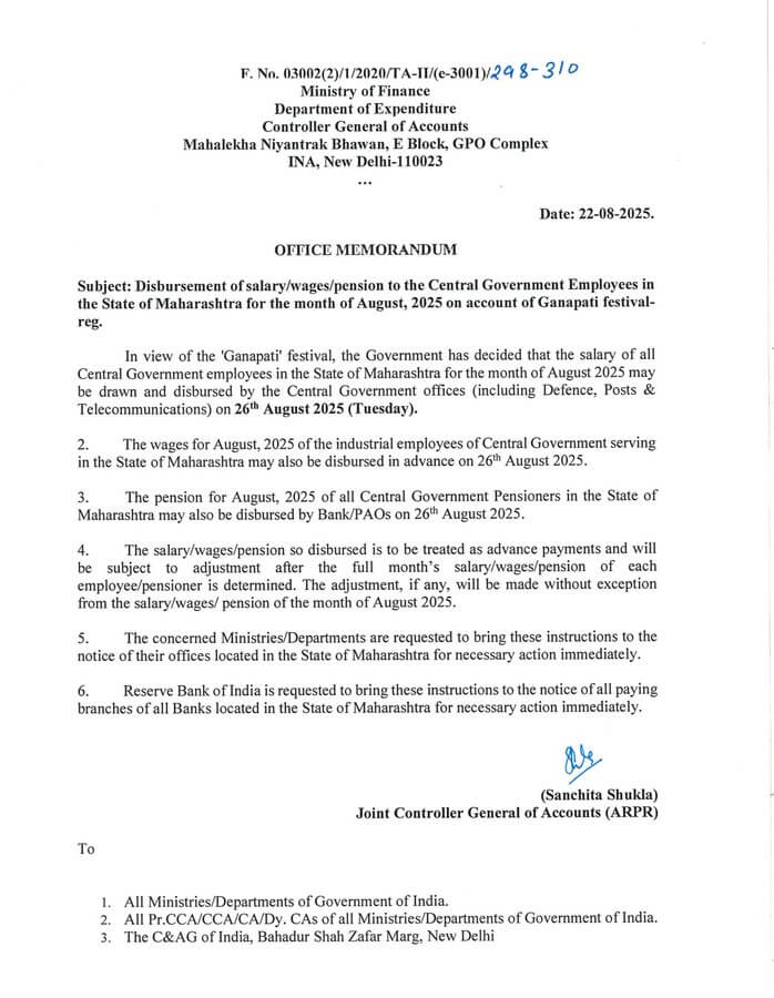 वित्त मंत्रालय की ओर से 22 अगस्त 2025 को जारी ऑफिस मेमोरेंडम के मुताबिक, महाराष्ट्र में काम करने वाले सभी केंद्रीय सरकारी कर्मचारियों की अगस्त की सैलरी 26 अगस्त 2025 (मंगलवार) को जारी कर दी जाएगी। इसमें रक्षा (Defence), डाक विभाग (Posts) और टेलीकॉम (Telecommunications) से जुड़े कर्मचारी भी शामिल हैं। बता दें कि इस साल गणपति उत्सव (गणेश चतुर्थी) 27 अगस्त 2025 को मनाया जाएगा, यानी त्योहार से एक दिन पहले ही सैलरी कर्मचारियों के अकाउंट में पहुंच जाएगी।खास बात ये है कि महाराष्ट्र में गणपति उत्सव बड़े ही धूमधाम से मनाया जाता है।