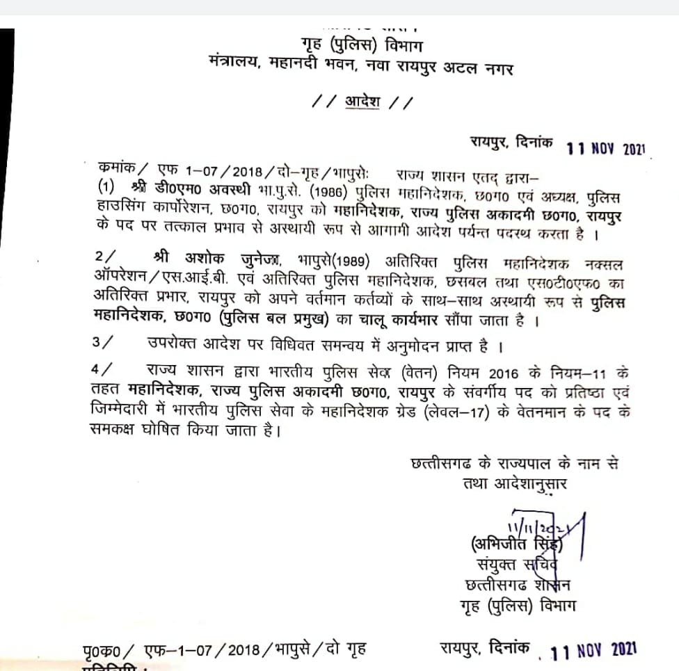 गृह विभाग द्वारा जारी एक आदेश के अनुसार, 1986 बैच के IPS अधिकारी अवस्थी, जो 19 दिसंबर, 2018 से डीजीपी के रूप में कार्यरत हैं, को रायपुर में राज्य पुलिस अकादमी के महानिदेशक के रूप में नियुक्त किया गया है।