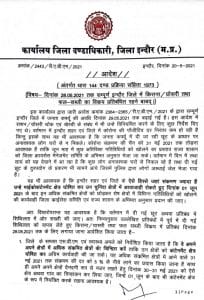 इंदौर कलेक्टर मनीष सिंह ने इस संबंध में धारा 144 के आदेश जारी किए हैं। इसके साथ ही पहले से लागू सभी आदेश को वापस ले लिया गया है। इंदौर जिले में सभी निजी किराना दुकानें 28 मई तक बंद रहेगी। साथ ही कुछ सब्जी मंडियों के अलावा जिले के सभी हाट बाजार से तत्काल प्रभाव से बंद कर दिए गए हैं। नए आदेश के मुताबिक बिग बाजार, ऑनडोर जैसी एजेंसियां किराना और ग्रोसरी आइटम की होम डिलीवरी करेगी। होम डिलीवरी को भी लेकर नियम सख्त किए गए हैं। जहां वाहनों में 2 कर्मचारी के अलावा अन्य कर्मचारी की उपलब्धता को प्रतिबंधित किया गया।