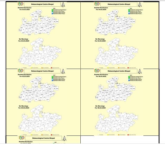 मार्च अंत में उत्तर-पश्चिमी हवाओं के प्रभाव से रीवा और शहडोल संभाग में न्यूनतम तापमान 22-24 डिग्री तो भोपाल सहित शेष प्रदेश में न्यूनतम तापमान सामान्य से 3-4 डिग्री अधिक रहेगा ।जबलपुर, शहडोल और नर्मदापुरम संभाग में हल्की बूंदाबांदी हो सकती है ।ग्वालियर, चंबल, इंदौर, उज्जैन, सागर और रीवा संभाग के कुछ जिलों में हीट वेव का असर रहेगा ।