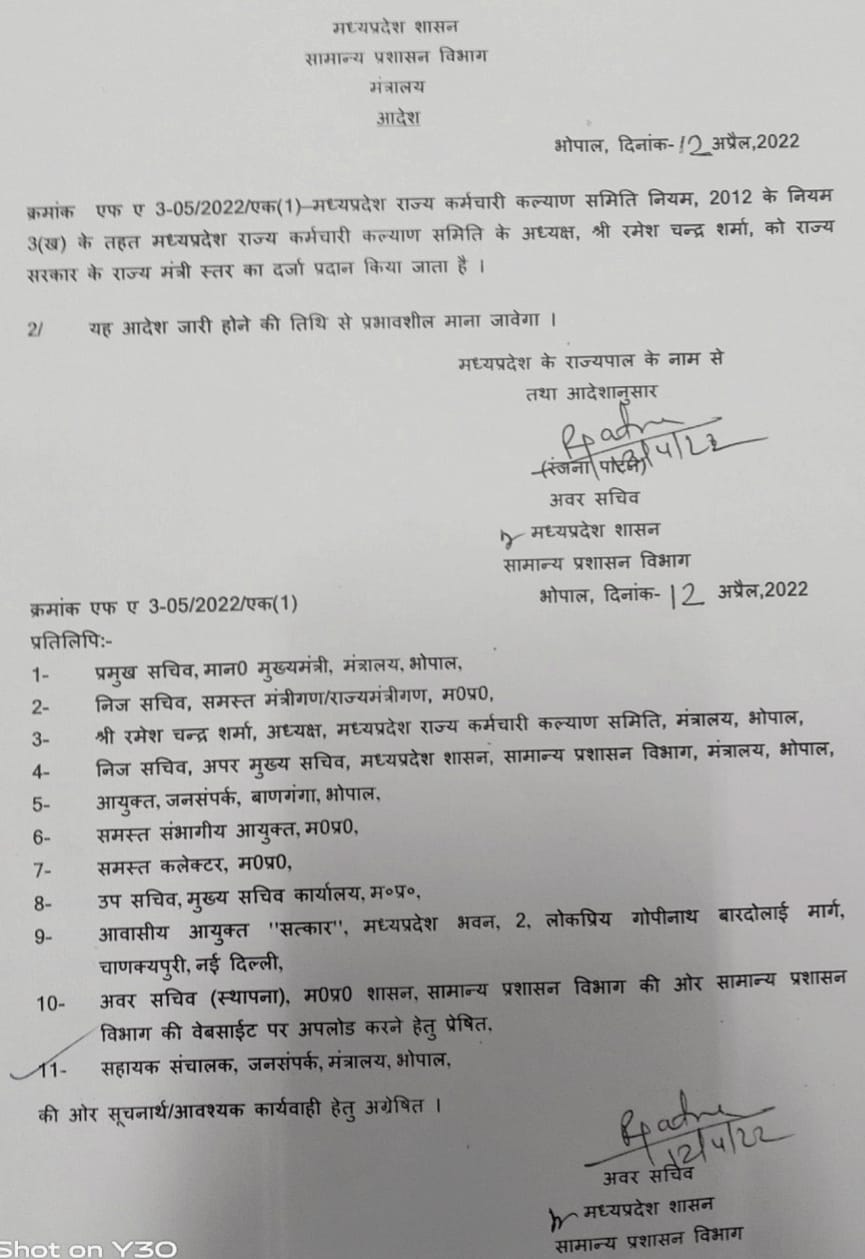 मामले में आदेश जारी करते हुए मध्यप्रदेश सामान्य प्रशासन विभाग ने कहा कि मध्य प्रदेश राज्य कर्मचारी कल्याण समिति नियम 2012 के नियम 3 (ख) के तहत मध्य प्रदेश राज्य कर्मचारी कल्याण समिति के अध्यक्ष रमेश चंद्र शर्मा को राज्य सरकार के राज्यमंत्री स्तर का दर्जा प्रदान किया जाता है।
