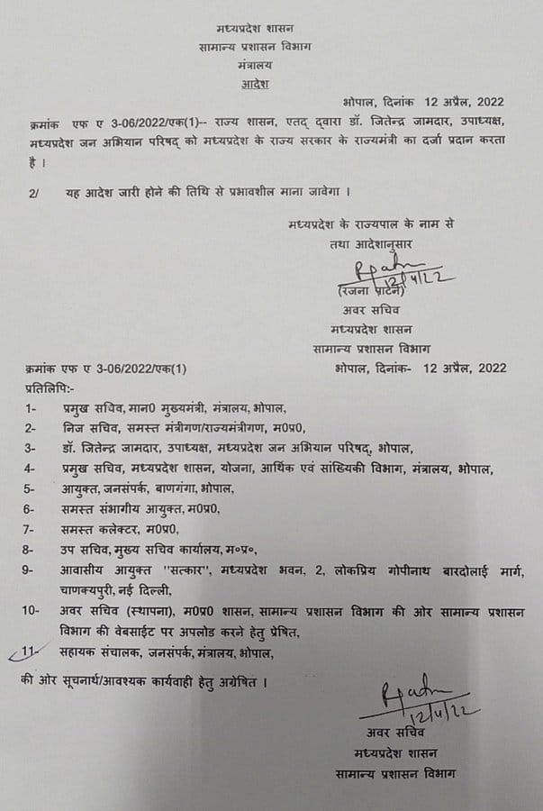 इसके अलावा राज्य शासन द्वारा मध्यप्रदेश जन अभियान परिषद उपाध्यक्ष जितेंद्र जामदार को मध्य प्रदेश के राज्य सरकार के राज्य मंत्री का दर्जा प्रदान किया गया है। 12 अप्रैल को जारी किए आदेश में कहा गया है कि राज्य शासन द्वारा जितेंद्र जामदार उपाध्यक्ष मध्यप्रदेश जन अभियान परिषद को मध्य प्रदेश के राज्य सरकार के राज्य मंत्री का दर्जा प्रदान किया गया। वहीं आदेश जारी होने की तिथि से प्रभावी माना जाएगा।