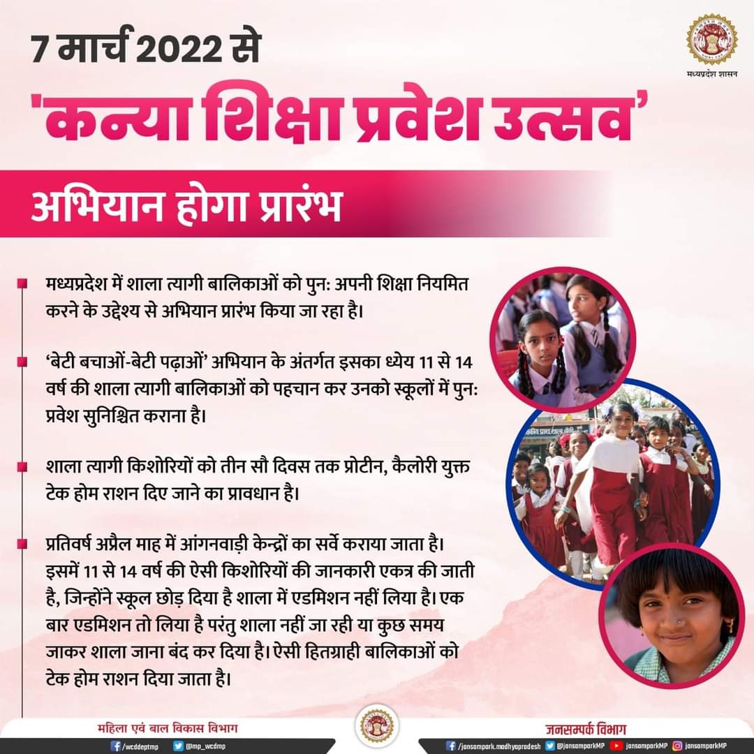 प्रदेश में शाला त्यागी बालिकाओं को पुन: अपनी शिक्षा नियमित करने के उद्देश्य से @mp_wcdmp द्वारा 7 मार्च से 'कन्या शिक्षा प्रवेश उत्सव' अभियान शुरू होगा। pic.twitter.com/GbZMi5d2aU— Jansampark MP (@JansamparkMP) March 6, 2022