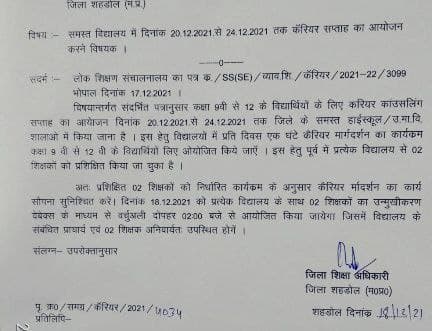 दरअसल जिला शिक्षा अधिकारी के द्वारा 18 दिसंबर को जारी हुए एक आदेश के मुताबिक MP Board 9वीं से 12वीं के छात्रों के लिए Carrer Councillng सप्ताह का आयोजन 20 दिसंबर से 24 दिसंबर तक किया जाएगा। इसमें उच्च माध्यमिक विद्यालय के नौवीं से 12वीं के छात्र कार्यक्रम के हिस्सेदार होंगे। साथ ही 2 शिक्षकों को प्रशिक्षित करने का काम पूरा किया जा चुका है। यह जो शिक्षक कैरियर मार्गदर्शन का कार्य करेंगे।