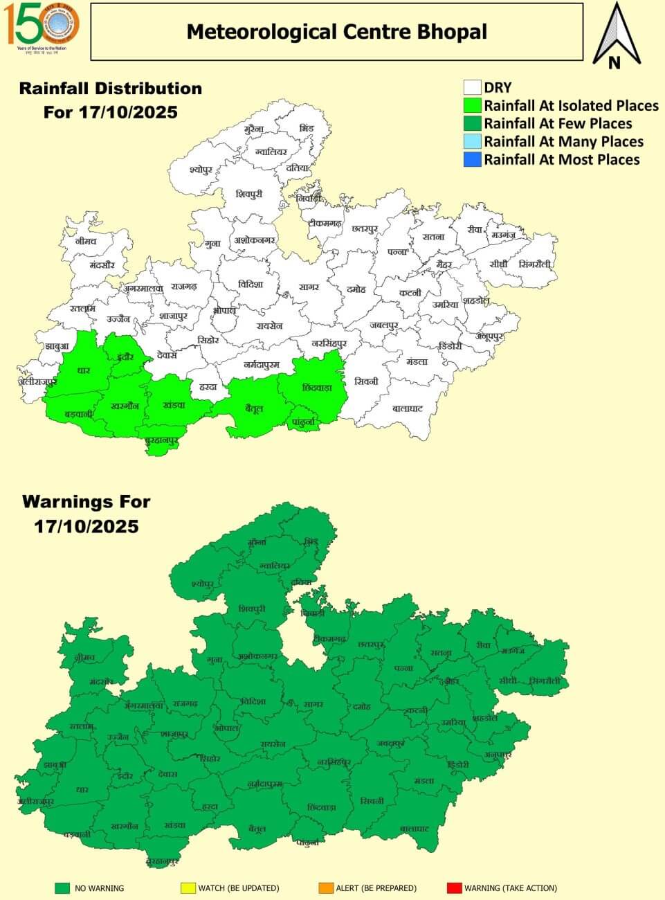 दक्षिण-पश्चिम मानसून आज, 16 अक्टूबर 2025 को पूरे देश से वापस लौट गया है। साथ ही, उत्तर-पूर्व मानसूनी वर्षा गतिविधि तमिलनाडु, पुडुचेरी और कराईकल, तटीय आंध्र प्रदेश, रायलसीमा, दक्षिण आंतरिक कर्नाटक और केरल-माहे क्षेत्र में प्रारंभ हो गई है। दक्षिण-पूर्व अरब सागर और उससे सटे लक्षद्वीप क्षेत्र की ऊपरी हवा में चक्रवातीय परिसंचरण विद्यमान है, जो समुद्र तल से 5.8 किलोमीटर की ऊँचाई तक फैला हुआ है और ऊँचाई के साथ दक्षिण की ओर झुका हुआ है। इसके प्रभाव से 19 अक्टूबर 2025 के आसपास केरल-कर्नाटक तटों के समीप दक्षिण-पूर्व अरब सागर और लक्षद्वीप क्षेत्र के ऊपर एक निम्न दबाव का क्षेत्र बनने की संभावना है। हवाओं का रुख पूर्वी होने औरबंगाल की खाड़ी से नमी मिलने के कारण से प्रदेश के अधिकतर जिलों में बादल छाए हुए हैं और कहीं-कहीं हल्की बारिश हो रही है।फिलहाल तीन-चार दिन तक मौसम का मिजाज ऐसा ही बने रहने की संभावना है। बढ़ गई है। शुक्रवार-शनिवार को जबलपुर, नर्मदापुरम, उज्जैन, इंदौर संभाग के जिलों में कहीं-कहीं बारिश होने की संभावना है।