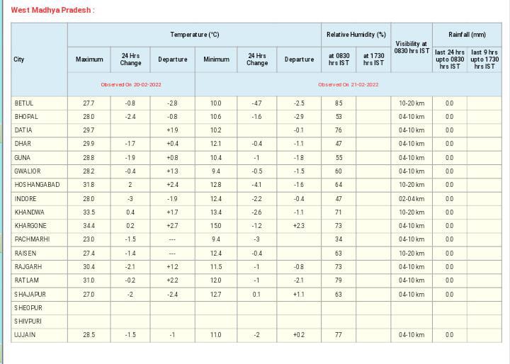 भोपाल, डेस्क रिपोर्ट। मंगलवार 22 फरवरी 2022 को नए पश्चिमी विक्षोभ के सक्रिय होने के चलते मध्य प्रदेश के मौसम (MP Weather Update Today 21 Feb 2022) में बदलाव के संकेत है। एमपी मौसम विभाग (MP Weather Department) की मानें आज 21 फरवरी 2022 को भी मौसम के शुष्क रहने के आसार है, लेकिन 22 फरवरी को एक नए पश्चिमी विक्षोभ के उत्तर भारत में प्रवेश करने के प्रभाव से राजस्थान पर प्रेरित चक्रवात बनने के भी संकेत और हवाओं के रूख में बदलने पर कहीं-कहीं बादल छाने और बौछारे पड़ने के आसार है।