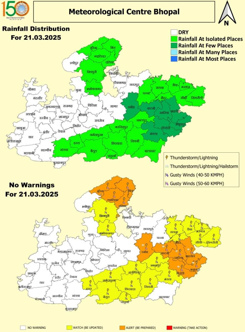 21 मार्च शुक्रवार को अनूपपुर, शहडोल, उमरिया, डिंडोरी, कटनी, दमोह, ग्वालियर, दतिया, भिंड और मुरैना जिले में तेज हवाओं के साथ बारिश और ओले गिरने का ऑरेंज अलर्ट जारी किया है। मंडला, नर्मदापुरम, बैतूल, हरदा, अशोकनगर, शिवपुरी, सिंगरौली, सीधी, रीवा, मऊगंज, सतना, जबलपुर, नरसिंहपुर, छिंदवाड़ा, सिवनी, मैहर और पांढुर्ना जिले में गरज-चमक के साथ बारिश की संभावना है।22 मार्च शनिवार को शहडोल, अनूपपुर और बालाघाट में गरज-चमक और हल्की बारिश हो सकती है।