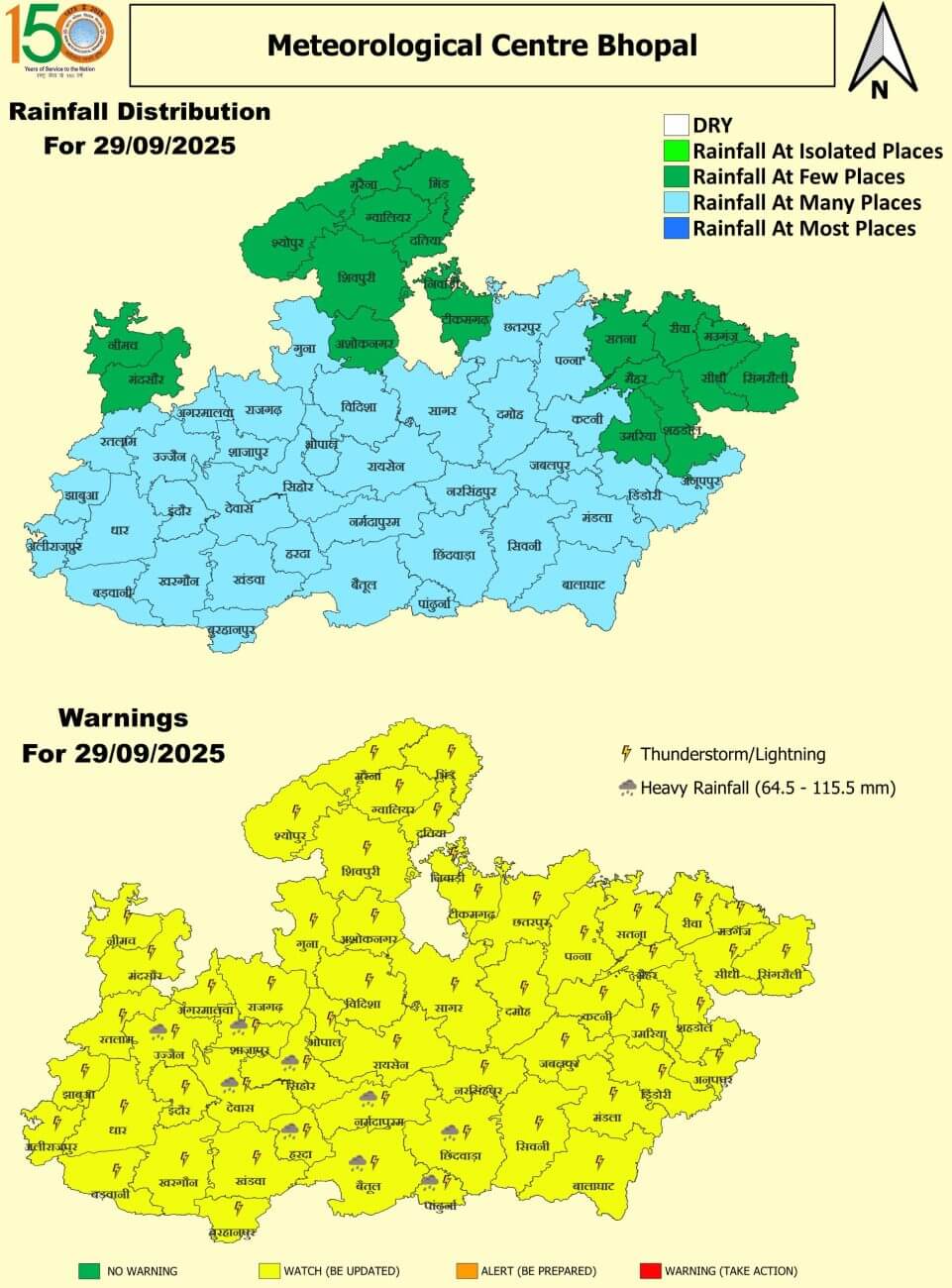 - 26 सितंबर: भोपाल, रायसेन, राजगढ़, सीहोर, विदिशा, नर्मदापुरम, हरदा, बैतूल, इंदौर, धार, झाबुआ, आलीराजपुर, बड़वानी, खरगोन, बुरहानपुर, खंडवा, जबलपुर, कटनी, नरसिंहपुर, सिवनी, छिंदवाड़ा, बालाघाट, मंडला, डिंडौरी, रीवा, सतना, सीधी, सिंगरौली, मऊगंज, मैहर, अनूपपुर, शहडोल उमरिया