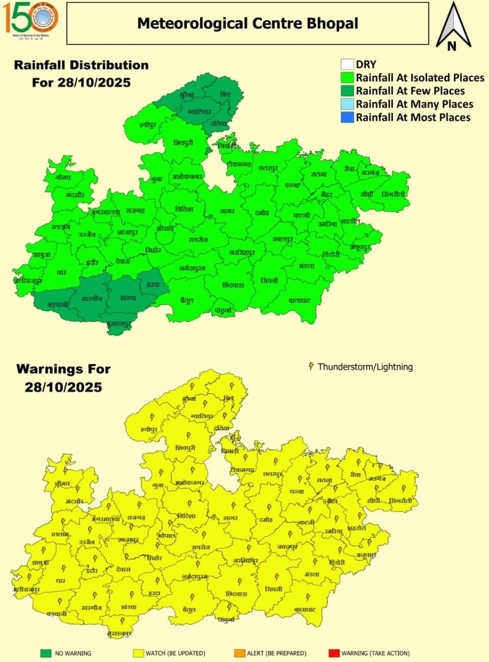 - आज 28 अक्टूबर को चंबल-ग्वालियर, इंदौर और उज्जैन संभाग के जिलों में कहीं तेज और कहीं हल्की बारिश ।