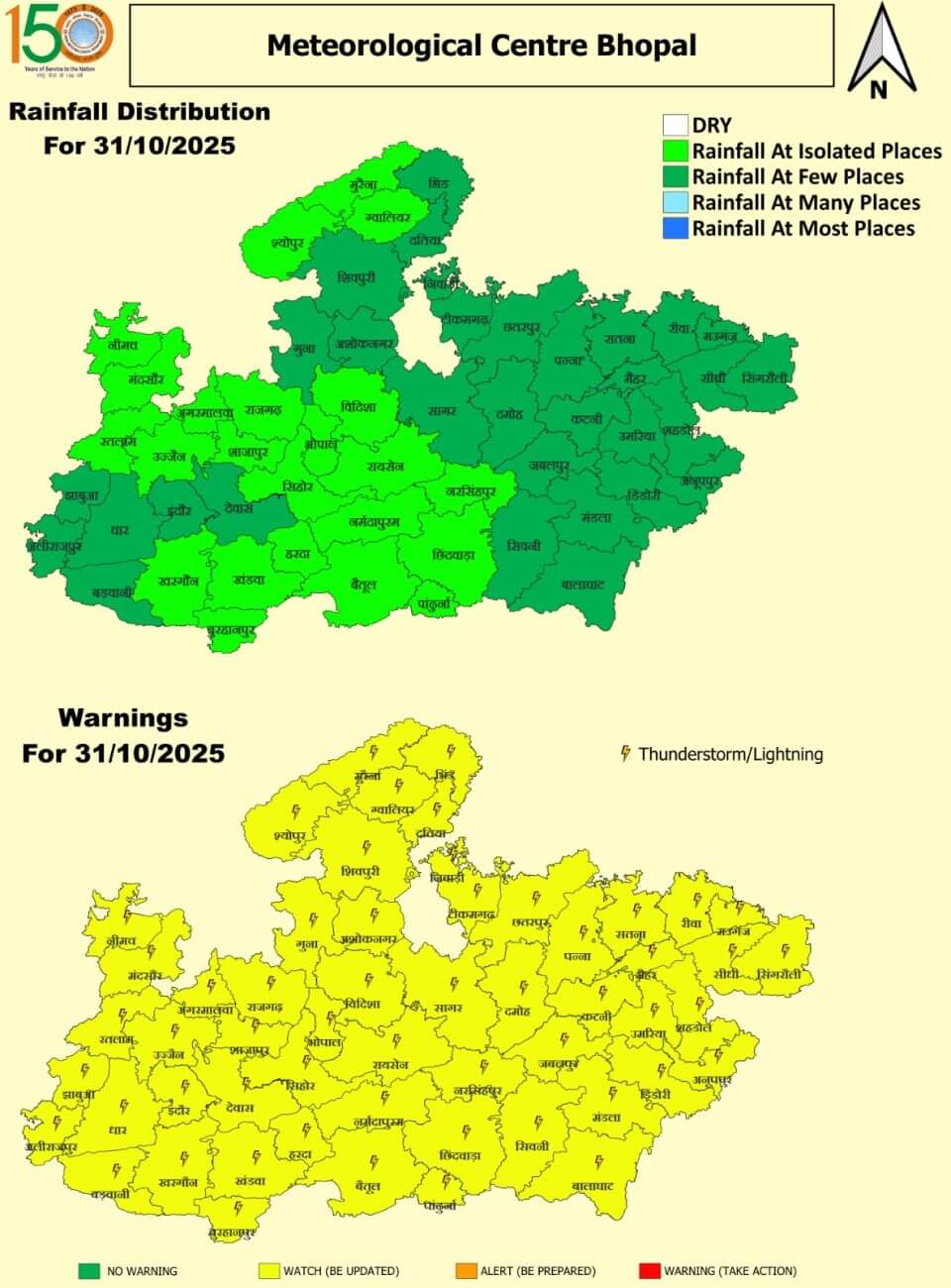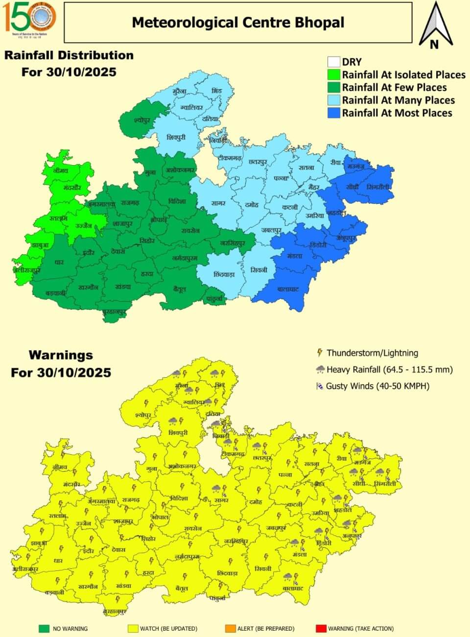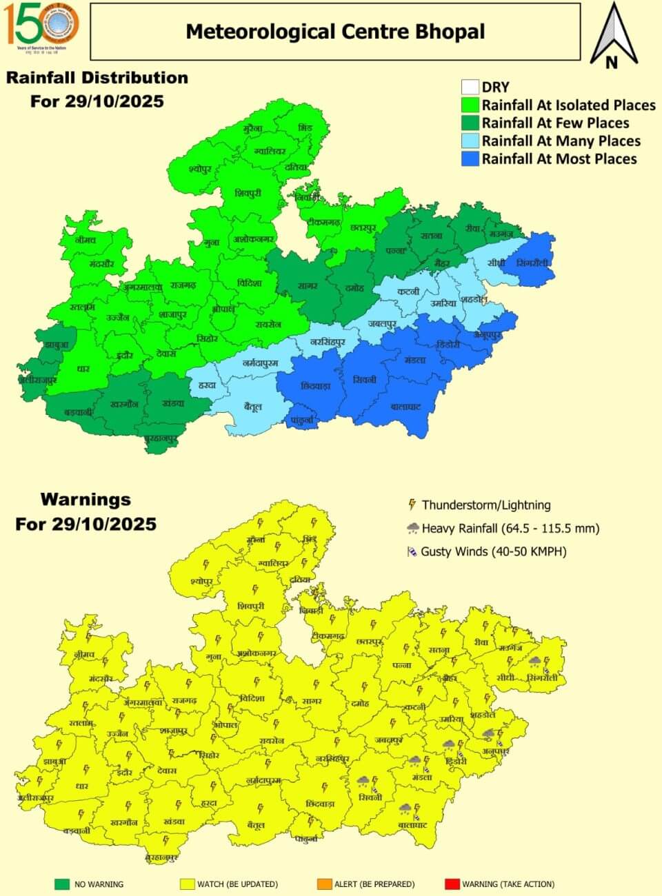 - 29 और 30 अक्टूबर को सिवनी, बालाघाट,भोपाल, इंदौर, उज्जैन, ग्वालियर, जबलपुर मंडला, डिंडौरी, अनूपपुर और सिंगरौली में भारी बारिश ।