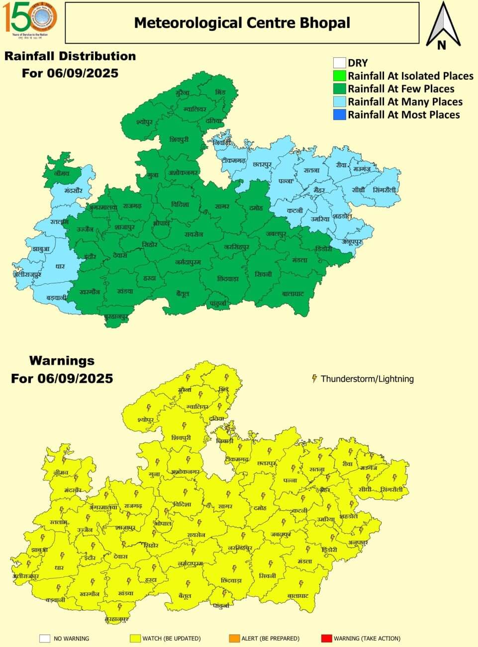 5 सितंबर : बड़वानी, अलीराजपुर, झाबुआ में अति भारी वर्षा, झंझावत वज्रपात कहीं-कहीं। बुरहानपुर, रतलाम, मंदसौर, डिंडोरी, मंडला, बालाघाट, खरगौन, धार में भारी वर्षा, झंझावत वज्रपात। भोपाल, विदिशा, रायसेन, सिहोर, राजगढ़, नर्मदापुरम, बैतूल, हरदा, खंडवा, इंदौर, उज्जैन, देवास, शाजापुर, आगर, नीमच,गुना, अशोकनगर, शिवपुरी, ग्वालियर, दतिया, भिंड, मुरैना, श्योपुरकलां, सिंगरौली, सीधी, रीवा, मऊगंज, सतना, अनुपपुर, शहडोल, उमरिया, कटनी, जबलपुर, नरसिंहपुर, छिंदवाड़ा, सिवनी, पन्ना, दमोह, सागर, छतरपुर, टीकमगढ़, निवाड़ी, मैहर, पांढुर्णा में झंझावत व वज्रपात कहीं कहीं।