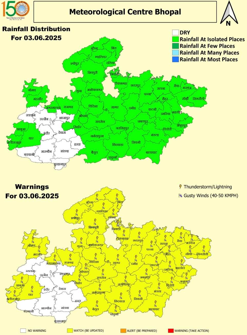 3 जून मंगलवार: भोपाल, ग्वालियर, मुरैना, भिंड, दतिया, निवाड़ी, टीकमगढ़, छतरपुर, रीवा, सीधी, सिंगरौली, पन्ना, दमोह, मंडला, बालाघाट, सिवनी, पांढुर्णा, छिंदवाड़ा, नरसिंहपुर, सागर, विदिशा, रायसेन, नर्मदापुरम, बैतूल, सीहोर, धार, अलीराजपुर, झाबुआ, मंदसौर, श्योपुर, शिवपुरी, अशोकनगर, गुना, राजगढ़, आगर-मालवा, सतना, मैहर, मऊगंज, कटनी, जबलपुर, उमरिया, शहडोल, अनूपपुर, डिंडौरी और नीमच में बारिश /हवा की रफ्तार 50 किलोमीटर प्रतिघंटा तक।