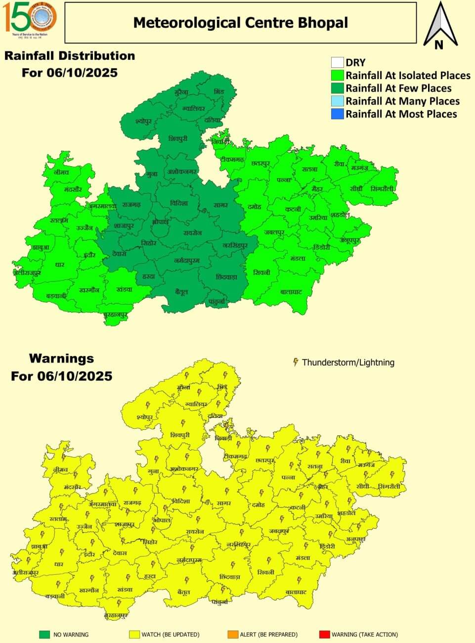 - जबलपुर, सतना, पन्ना, मैहर, दमोह, कटनी, उमरिया, शहडोल, अनुपपुर, डिंडोरी, मंडला और नरसिंहपुर जिलों में हल्की से मध्यम बारिश ।