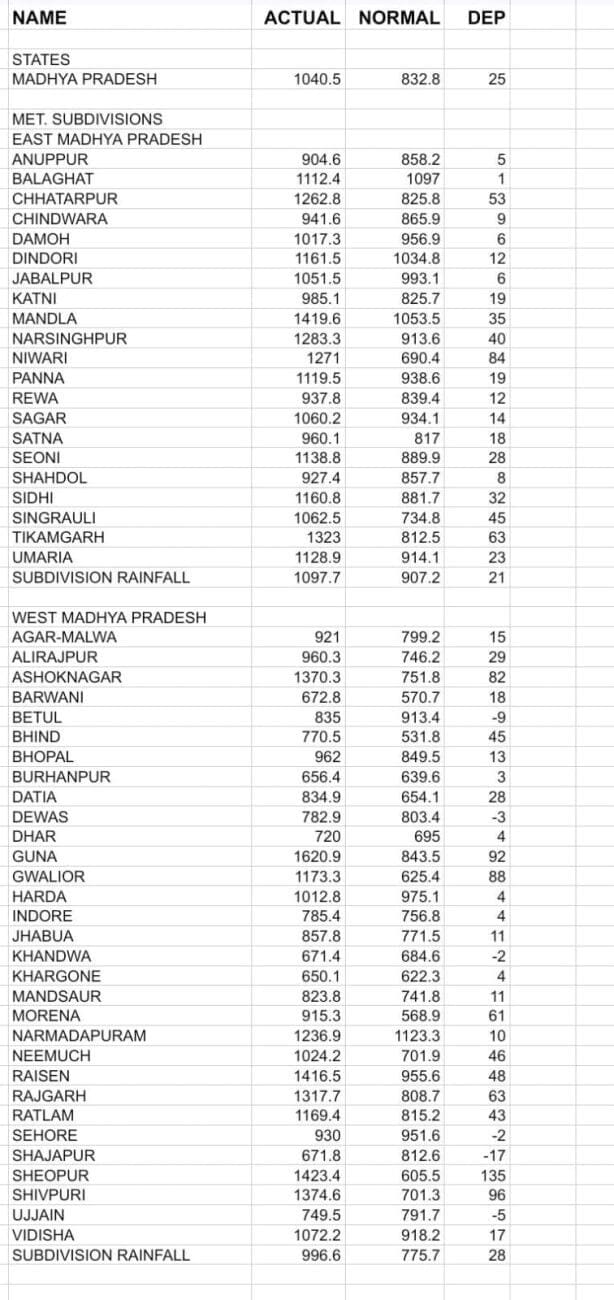 मध्य प्रदेश में दीर्घावधि औसत से 25% अधिक वर्षा हुई है। पूर्वी मध्य प्रदेश में औसत से 21% और पश्चिमी मध्य प्रदेश 28% अधिक वर्षा हुई है। एमपी में अब तक 40.6 इंच बारिश हो चुकी है, जो सीजन की 110 प्रतिशत है। अब तक 32.4 इंच बारिश होनी थी। प्रदेश की सामान्य बारिश औसत 37 इंच है। पिछले मानसूनी सीजन में औसत 44 इंच बारिश हुई थी। गुना सबसे ज्यादा , 63.1 इंच , श्योपुर में 55.8 इंच, मंडला में 55.8 इंच और शिवपुरी में 53.3 इंच बारिश हुई है। खरगोन में सबसे कम 25.1 इंच, खंडवा में 25.4 इंच, बुरहानपुर में 25.5 इंच, बड़वानी में 25.6 इंच और शाजापुर में 26.2 इंच बारिश हो चुकी है।