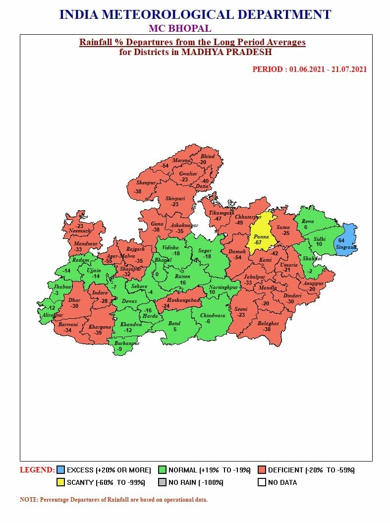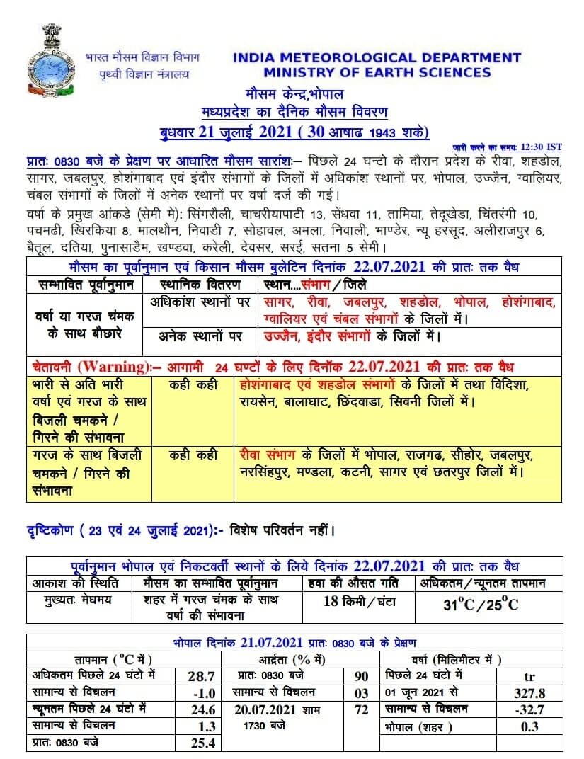 मौसम विभाग (MP Weather Update) के अनुसार, आज बुधवार 21 जुलाई 2021 शहडोल, जबलपुर इंदौर, रीवा, उज्जैन, होशंगाबाद, भोपाल, सागर, ग्वालियर-चंबल संभाग के जिलों में कहीं कहीं बौछारें पड़ने की संभावना हैं। वही होशंगाबाद और शहडोल संभाग के साथ विदिशा, रायसेन, बालाघाट, छिंदवाड़ा और सिवनी आदि जिलों में भारी बारिश का येलो अलर्ट जारी किया गया है। इसके अलावा रीवा संभाग के साथ भोपाल, राजगढ़, सीहोर, जबलपुर, सागर, नरसिंहपुर, मंडला, कटनी और छतरपुर में बिजली चमकने और गिरने के साथ 18 प्रति घंटा की रफ्तार से हवा चलने के भी आसार है।