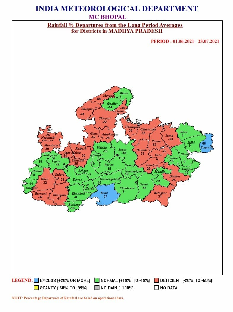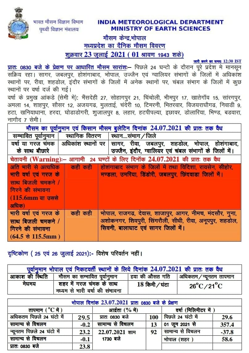 मौसम विभाग (MP Weather Update) के अनुसार, आज शुक्रवार 22 जुलाई 2021 शहडोल, जबलपुर इंदौर, रीवा, उज्जैन, होशंगाबाद, भोपाल, सागर, ग्वालियर-चंबल संभाग के जिलों में कहीं कहीं बौछारें पड़ने की संभावना हैं।वही 11 जिलों में रेड अलर्ट के साथ अति भारी बारिश की संभावना और 18 जिलों में भारी बारिश की संभावना के साथ ऑरेंज अलर्ट जारी किया गया है।वही अभी एक हफ्ते तक मौसम के ऐसे ही बने रहने के आसार है, कभी रुक-रुक कर तो की तेज बारिश होगी। होशंगाबाद में नर्मदा का जलस्तर 935 फीट पर पहुंच गया है।बैतूल, छिंदवाड़ा में तेज बारिश के चलते तवा डैम 24 घंटे में 7 फीट पानी बढ़ गया है।