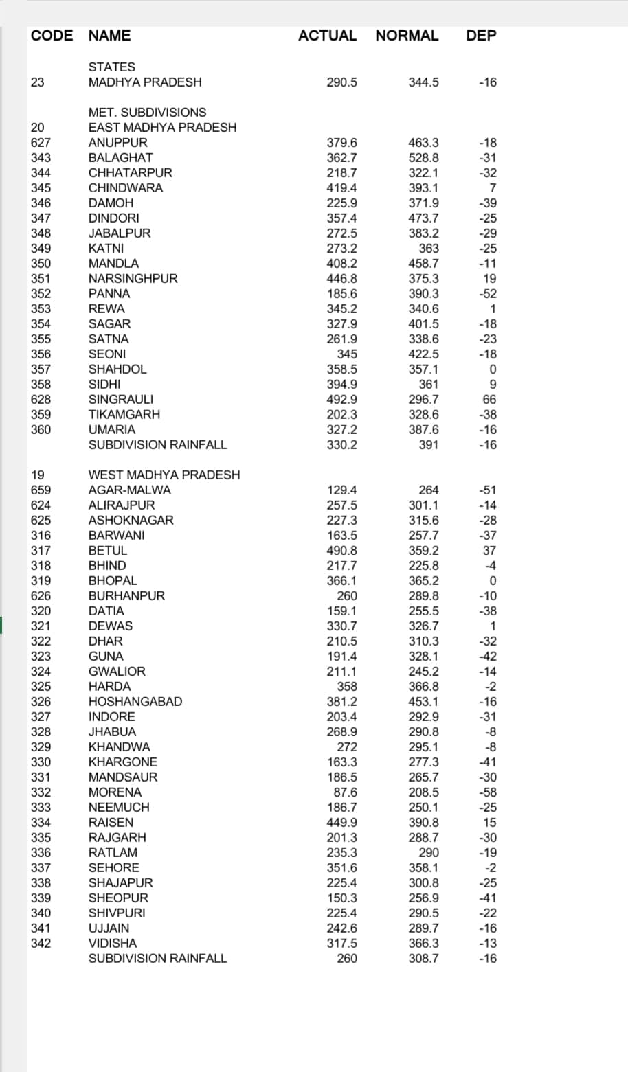 पिछले 24 घंटे में पचमढ़ी में 63.0, भोपाल में 58.6, छिंदवाड़ा में 57.4, शाजापुर में 57.0, नरसिंहपुर में 56.0, बैतूल में 53.2, होशंगाबाद में 47.4, खंडवा में 42.0, दमोह में 35.0, खजुराहो में 33.2, जबलपुर में 24.6, सीधी में 14.6, उमरिया में 14.4, मंडला में 14.0, ग्वालियर में 13.6 मिमी बारिश दर्ज की गई है।