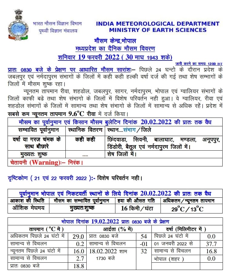 मौसम विभाग (MP Weather Forecast) के मुताबिक, आज 19 फरवरी 2022 को छिंदवाड़ा, सिवनी, बालाघाट, मंडला, अनूपपुर, डिंडौरी, बैतूल और नर्मदापुरम जिलों में वर्षा या गरज चमक के साथ बौछार आसार है। पिछले 24 घंटों में जबलपुर और नर्मदापुरम के संभागों के जिलों में कहीं कहीं हल्की बारिश दर्ज की गई। वही सबसे न्यूनतम तापमान 9.6 डिग्री सेल्सियस रीवा में दर्ज किया, जबकि शेष संभागों में तापमान में विशेष परिवर्तन नहीं हुआ।ग्वालियर में 20 फरवरी से फिर हवा का रुख उत्तर से पश्चिम होने से फिर ठंड बढ़ सकती है। 22 फरवरी के बाद नया पश्चिमी विक्षोभ आएगा, जो फिर से मौसम बदलेगा और तापमान में बढ़ोतरी शुरू होगी।