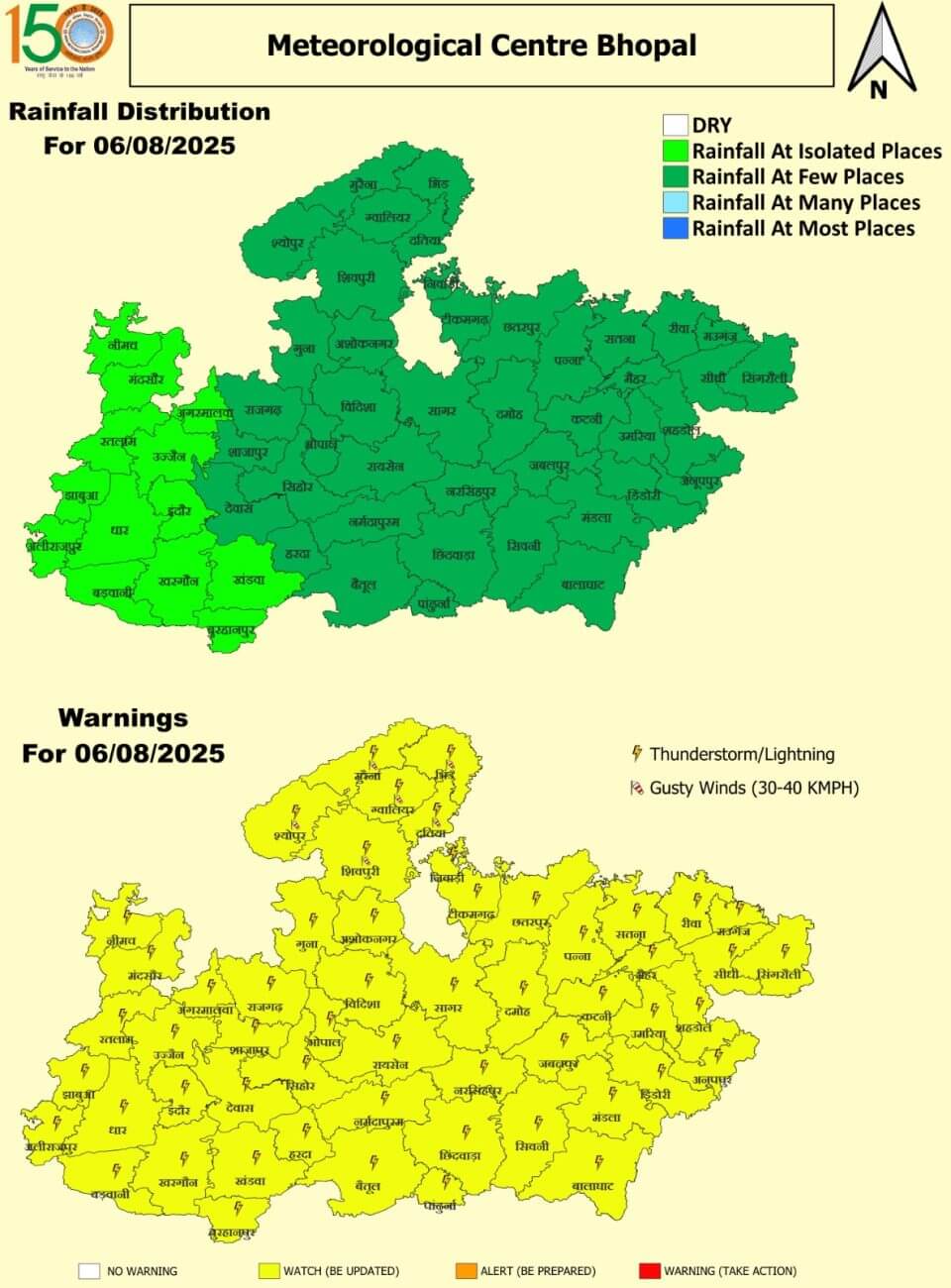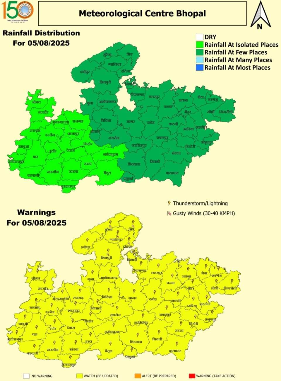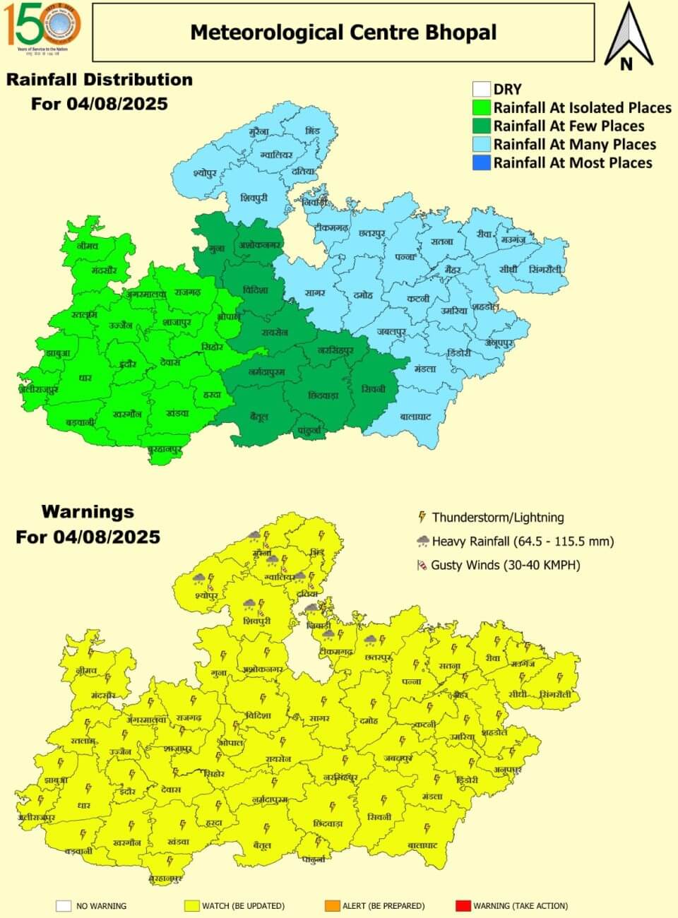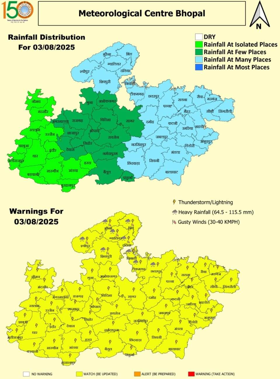 मध्य प्रदेश में 6 अगस्त तक बारिश का दौर जारी रहने वाला है। खास करके अगले 48 घंटों के लिए ग्वालियर, चंबल और सागर संभाग में भारी बारिश का अलर्ट जारी किया गया है। यहां अगले 24 घंटे में साढ़े 4 इंच तक पानी गिर सकता है। भोपाल-इंदौर समेत एक दर्जन जिलों में बूंदाबांदी का दौर जारी रहेगा। 1 जून से 2 अगस्त तक औसत से 52% अधिक वर्षा हुई है। पूर्वी में औसत से 56% अधिक और पश्चिमी में औसत से 49% अधिक वर्षा हुई है।अब तक औसत 30 इंच से ज्यादा बारिश हो चुकी है।