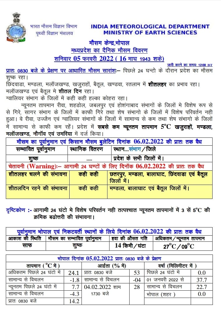 भोपाल, डेस्क रिपोर्ट। नए वेदर सिस्टम के चलते मध्य प्रदेश के मौसम (MP Weather Update Today 5 February 2022) के मिजाज बदलने लगे है। पिछले 23 घंटे से एक बार फिर ठंड में तेजी आई है और कई जिलों में कोहरे भी छाया रहा। बदलने लगा है।पिछले 24 घंटे में, खंडवा, खुजराहो, मंडला, मलाजखंड, नौगांव और उमरिया में न्यूनतम तापमान 5 डिग्री सेल्सियस दर्ज किया गया है। एमपी मौसम विभाग (MP Weather Department) ने आज 5 फरवरी 2022 को मौसम के शुष्क रहने की संभावना है, लेकिन 18 किमी/घंटा की रफ्तार से हवा चल सकती है और 5 जिलों में शीतलहर और 3 जिलों में कोल्ड डे की चेतावनी जारी की गई है।
