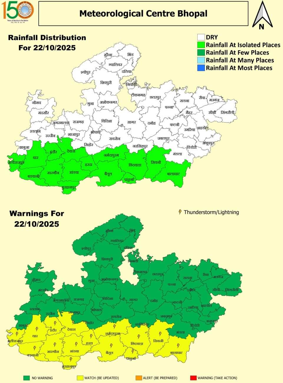 - इंदौर, अलीराजपुर, धार, बड़वानी, खरगोन, देवास, खंडवा, हरदा, बुरहानपुर, नर्मदापुरम, बैतूल, छिंदवाड़ा, पांढुर्णा, सिवनी और बालाघाट में हल्की बारिश ।
