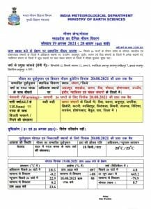 मौसम विभाग ने जबलपुर, शहडोल, सागर, रीवा, भोपाल, होशंगाबाद, उज्जैन, इंदौर, ग्वालियर-चंबल संभाग मैं बारिश की संभावना जताई है। इसके साथ ही सागर संभाग सहित रीवा, सतना, अनूपपुर, उमरिया, डिंडोरी, कटनी, नरसिंहपुर, छिंदवाड़ा, सिवनी, राजगढ़, विदिशा, रायसेन, होशंगाबाद, बेतुल, धार बारिश का येलो अलर्ट जारी किया गया है।