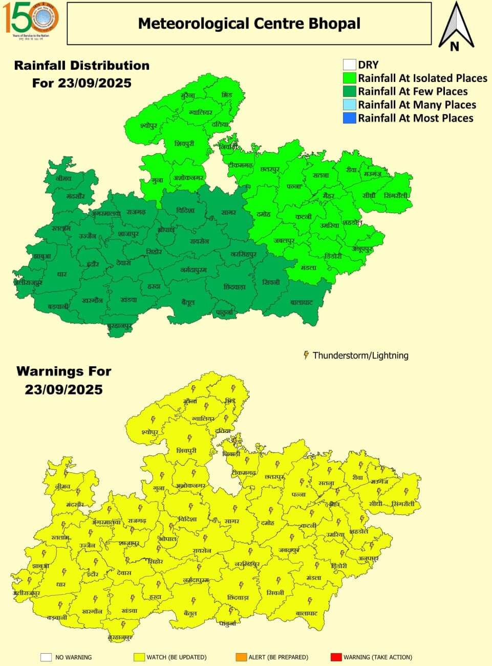 एक तरफ गुजरात, राजस्थान, हरियाणा , पंजाब ,यूपी, दिल्ली, हिमाचल प्रदेश, जम्मू और कश्मीर से मानसून विदाई शुरू हो गई है वही दूसरी तरफ मध्य प्रदेश में अक्टूबर के पहले हफ्ते तक बारिश की गतिविधियां जारी रहने की संभावना है। 48 घंटे बाद यानि 25 सितंबर को एक नया वेदर सिस्टम एक्टिव होने जा रहा है, जिससे प्रदेश में 2-3 दिन झमाझम बारिश होने का अनुमान है।अगले 24 घंटों में बैतूल, बुरहानपुर, खरगोन और बड़वानी में तेज बारिश की संभावना जताई गई है।इसके बाद मानसून की विदाई शुरू होगी। प्रदेश में अब तक औसत 43.9 इंच बारिश हो चुकी है, जबकी प्रदेश की सामान्य बारिश औसत 37 इंच है।
